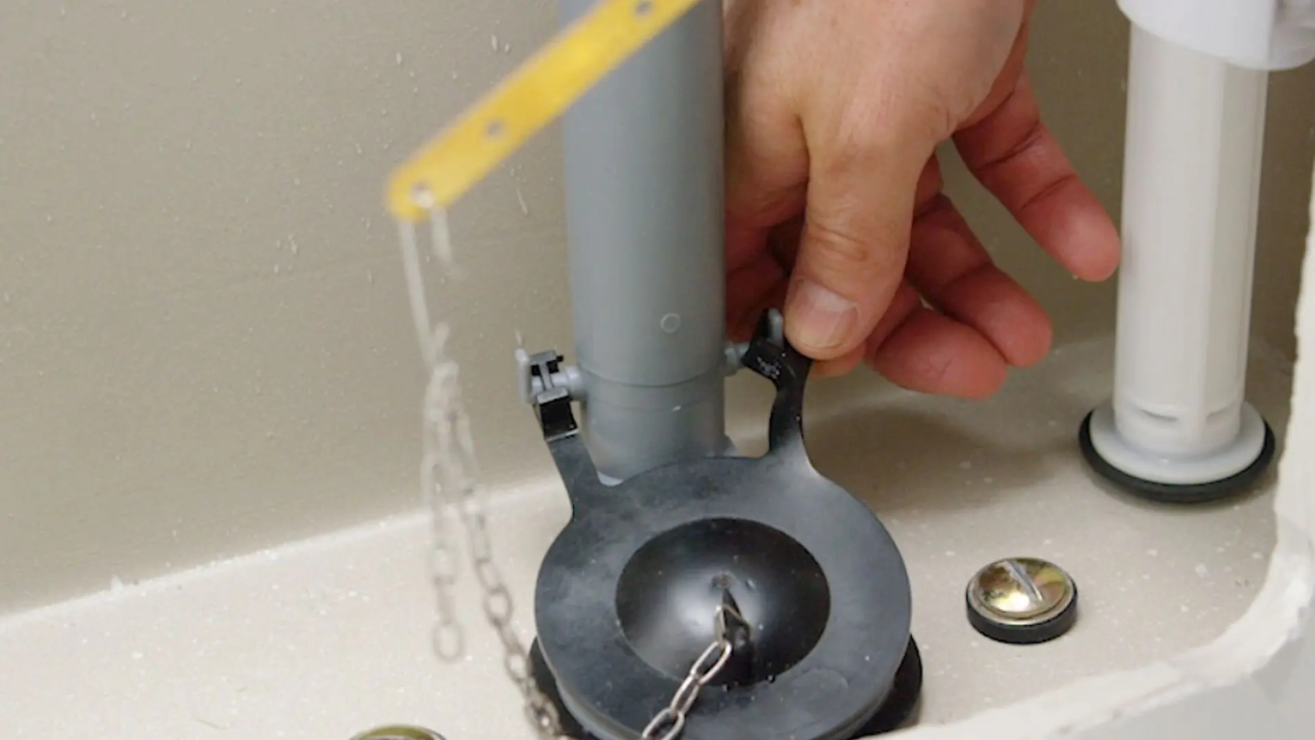 Pull the flush handle to test the chain’s tension, making sure the flapper lifts fully without pulling too far. Proper adjustment ensures the tank lever arm can lift the flapper without restricting the water flow or creating slack that might stop running water from the tank.
